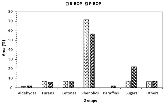 To assess the distribution of products across different samples, the compounds identified via GCMS were categorized into six groups based on their functional groups: phenols, esters, ketones, aldehydes, sugar derivatives, and furans. Figure 6 summarizes the proportional amounts of compound classes in the bio-oil organic phase (BOP). Each group’s total proportional area (%) was determined by summing each compound’s proportional area (%) within that category.