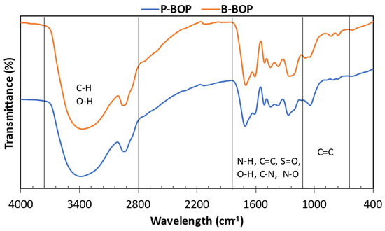 FTIR spectra of bio-oil organic phase for pine (P-BOP) and bamboo (B-BOP).