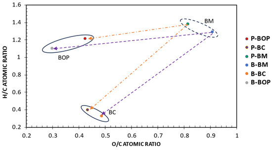 The atomic ratios of hydrogen/carbon (H/C) and oxygen/carbon (O/C) of pine (P) and bamboo (B) biomass (BM), biochar (BC), and bio-oil organic phase (BOP) were evaluated and compared as shown in the Van Krevelen diagram in Figure 8. This plot tracks changes in the molecular composition of feedstocks during pyrolysis, offering insight into the evolution of product distribution and the degree of aromaticity in the material [91]. In pyrolysis, the van Krevelen plot is often used to understand the progression from biomass or other organic materials to pyrolytic products, such as bio-oils and pyrolysis gases. It shows how the H/C and O/C ratios change as a function of temperature and reaction conditions. Van Krevelen [91] first discussed the concept in relation to the combustion and pyrolysis of organic materials, particularly coals. The plot in Figure 8 highlights three distinct regions for biomass, biochar, and bio-oil organic phase, with the biomass at the top right corner and the bio-oil organic phase at the lower left corner. Higher H/C ratios are desired for the fuel to be more efficient through the reduction in CO emissions. Pine bio-oil resulted in higher H/C and O/C ratios, while bamboo bio-oil exhibited lower H/C and O/C ratios. These results imply that pine bio-oil is more efficient in reducing CO emissions during bio-oil stabilization and hydrotreatment. Pine biochar exhibited higher H/C and lower O/C ratios. Meanwhile, bamboo bio-oil exhibited higher O/C and lower H/C ratios. The decreased H/C ratios observed in the pine and bamboo biochar samples suggest that higher levels of aromatic compounds were formed in the biochar structures due to hydration, decarboxylation, and decarbonylation during processing at the operating temperature. Consequently, this process enriched the biochar with carbon, resulting in a surface that is highly resistant to water [90,92,93,94].