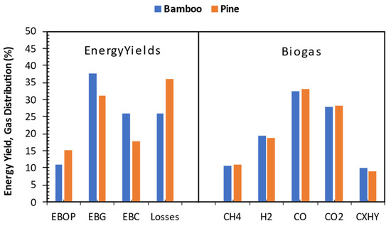 Biogas analysis and energy yields for bio-oil organic phase (EBOP), biogas (EBG), biochar (EBC), and losses.