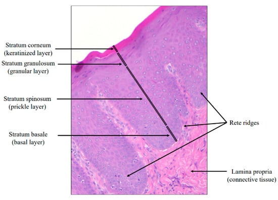 Let us briefly review the knowledge about the oral mucosa (mucosa of the mouth) [,]. As depicted in Figure 1, the oral epithelium and the lamina propria constitute oral mucosa. The oral epithelium is composed of four layers including (1) the stratum corneum, (2) the stratum granulosum, (3) the stratum spinosum, and (4) the stratum basale. The stratum basale or basal layer is adjacent to the connective tissue.
