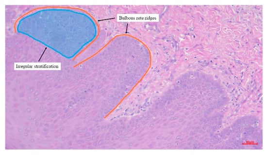 There are seven types of OPMDs from the WHO classification. These include leukoplakia, erythroplakia, oral submucous fibrosis (OSMF), actinic cheilitis, palatal lesions in reverse smokers, lichen planus, and discoid lupus erythematosus []. Not all of these lesions will progress to squamous cell carcinoma. Only the lesions that contain dysplastic features can develop to oral cancer. Thus, dysplastic features must be detected and differentiated from these lesions. While the histopathology of squamous cell carcinoma is characterized by dysplasia and invasion of squamous epithelial cells into the basement membrane, the abnormalities go deeper than the epithelial layer and keratin pearls are sometimes found. In this study, we are interested in irregular stratification and bulbous rete ridges, which are considered architectural dysplastic features (Figure 2). Each has its own abnormal characteristics. In the epithelium, irregular stratification can be observed when cell arrangement is uneven. As can be seen, rete ridges are closely connected to the connective tissue. What we want to determine are bulbous rete ridges or the rete ridges that possess the shape of a broad base and a narrow top.