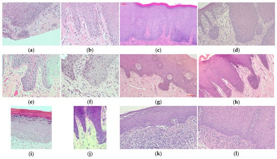 Sample microscopic (histologic) images in the dataset taken at 400× magnification. (a–h) are the images that contain irregular stratifications, bulbous rete ridges, or both. (i–l) are the normal images with no architectural dysplastic features.