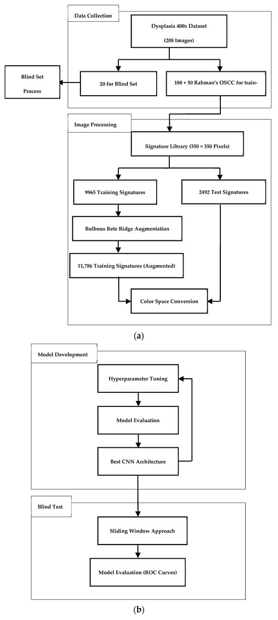 Thus, the structure of this paper starts by elaborating upon the oral epithelial dysplasia dataset used, which will provide information about how the images look for both no-dysplasia and architectural dysplasia characteristics. Next, all technical details are laid out in Section 3, including CNNs and their relevant components. Finally, the experimental results that reflect the performances of the models on the signature library and the blind set are explained.