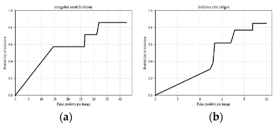 In Figure 6, the ROC curves of the irregular stratification and bulbous rete ridge classes are shown, respectively. For the irregular stratification class, the model attains a probability of detection up to 0.8571, and the lowest false positives per image, 31.9. The probability of detection for bulbous rete ridges is the highest, at 0.8462. The best-performing threshold of detecting bulbous rete ridges produces 8.65 false positives per image. Examples of correct and incorrect detection of both classes are shown in Figure 7 and Figure 8, respectively. In Figure 8, we can see that the area where the system detects bulbous rete ridge has similar shape to that of the real bulbous rete ridge class. The structure of the cell in the area that the system states that it is irregular stratification is also similar to the real irregular stratification.