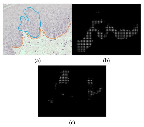 Examples of correct detection of (a) original image with labeled classes (blue line: irregular stratification, orange line: bulbous rete ridge), (b) bulbous rete ridge classes, and (c) irregular stratification classes.