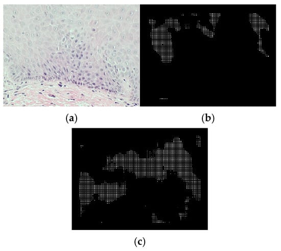 There are research works involving utilizing artificial intelligent techniques in classifying between oral cancer tissue and normal tissue, such as [,,,]. However, these works only performed analysis of the cytological atypia and did not include the epithelial architecture. Since the study of artificial intelligence in detecting OPMDs from abnormalities and indicating an abnormal level in the epithelial dysplasia is difficult, there are few studies in dysplasia classification based on handcrafted features [,,,]. Also, there are limitations. Bashir et al. [] proposed dysplasia classifiers based on two steps, layer segmentation with the semantic segmentation network and a random forest model with morphometric features. Traditional support vector machine (SVM) and K-nearest neighbor (K-NN) can also be used as classifiers to perform binary classification of OED based on handcrafted image features [,]. Although the merit of using these handcrafted features is their explainability, their performances might be inferior to the convolutional neural network-based models that can automatically extract features [,]. There are also many endeavors in exploiting deep neural networks such as the works [,,,,,,].