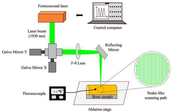To address the limitations of conventional laser technology, femtosecond laser has been extensively studied in recent years and has found widespread applications in the medical field [24,25]. Femtosecond laser, with the pulse width measured in femtoseconds (1 fs = 10−15 s), can be focused on an extremely small area, achieving ablation accuracy at the micron or even sub-micron level [26,27,28]. When focused on tissues, the femtosecond laser can rapidly ionize the target with minimal heat accumulation [29,30]. Lo et al. [31] reported that femtosecond laser ablation, compared to mechanical drilling, minimized collateral damage and promoted faster bone healing. While these properties have made femtosecond lasers a promising tool for bone tissue surgeries, achieving a balance between ablation efficiency and biosafety remains a challenge in clinical applications [32,33,34,35].