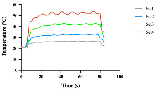 Temperature of bone surface during laser ablation. Set 1, 2, 3, and 4 correspond to laser energy densities of 0.58 J/cm2, 0.81 J/cm2, 1.05 J/cm2, and 1.28 J/cm2, respectively. The ablation time for each laser set was 80 s.
