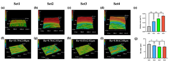 Figure 3f–i demonstrate that the mean Ra values of the ablated bone surfaces were 10.79 μm, 9.78 μm, 8.83 μm, and 8.86 μm for laser set 1–4, respectively. The differences between these groups were not statistically significant (p > 0.05, N = 10 per group).