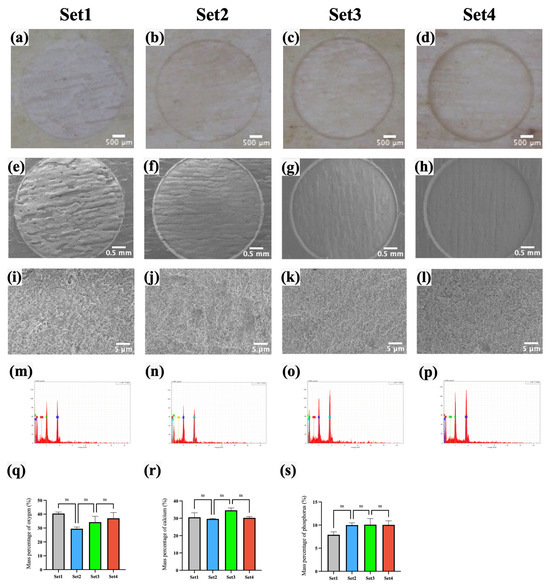 Morphology and elemental composition analysis after ablating by four laser sets. (a–d) Stereomicroscopy images. (e–l) SEM images. (m–p) EDS spectra. (q–s) Comparison of the surface elemental mass percentages of O, Ca, and P. (ns: p > 0.05, N = 10 per group.).