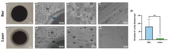 The diameters of the cavities prepared by mechanical drilling and laser ablation were 4080.09 ± 45.45 μm and 4006.58 ± 18.09 μm, respectively. As shown in Figure 5i, the deviations in cavity diameters were 80.09 ± 45.45 μm for the bur group and 6.58 ± 18.09 μm for the laser group. The difference was statistically significant (p < 0.001, N = 5 per group). The accuracy of laser ablation was superior to that of mechanical drilling, this may be attributed to the vibrations during drilling and wear of the burs.