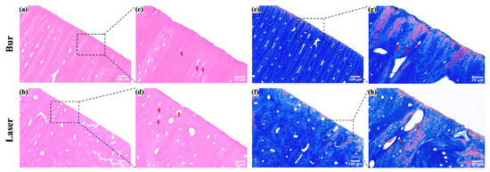 Histological images of the margin of cavities after laser ablation and mechanical drilling. (a,b) HE staining images of the margin of cavities. (c,d) Magnified images of the boxed areas in (a,b). (e,f) Masson staining images of the margin of cavities. (g,h) Magnified images of the boxed areas in (e,f).