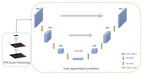 In order to make the network output more accurate and the segmentation to have better robustness and a shorter output time, this work constructed the Unet + FPN network architecture (Figure 2), where Unet is a classic network architecture for medical image segmentation [10] and FPN is an efficient architecture for tiny object detection [11]; their specific design and built-in parameters are detailed in the Supplementary Materials. Overall, the network architecture proposed in this paper is a two-dimensional convolutional network with a total of three channels of RGB for the input and two channels for the output to display the corresponding segmentation results, and the specific display is shown in the Supplementary Materials.