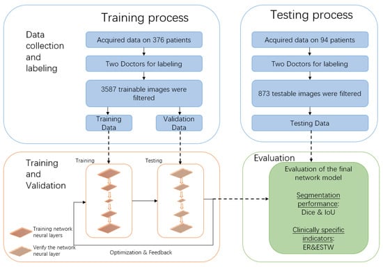 The data used in this study were MRI scan sequence images of patients (device GE HealthCare, 3.0T MR750 WIDE, GE HealthCare, Beijing, China). Each sequence consisted of 15~20 2D images. The size of the images was 320 × 224 (pixel), the field of view (FOV) was 16 × 16 (cm), the thickness was 3 mm, and the interval between images was 0.5 mm [5]. For each patient, it is often necessary to take multiple sequences because of the problem of moving during image acquisition, from which the most clearly imaged set of sequences was then selected as the data for training. Figure 1 shows examples of the workflow.