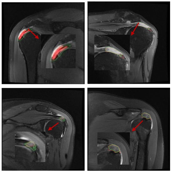 For the clinically designed special metrics, the accuracy of the estimation of the stop tear distance can reach 0.92, showing that the algorithm we designed is closer to the doctor’s judgment in estimating the stop tear distance of a rotator cuff tear. For the estimation performance of the segmented region retraction, an accuracy of 0.8 was achieved, indicating that the estimation of the number of tear image layers for the same patient was also close to the doctor’s diagnosis. Compared with the two mathematical metrics of IoU and the Dice coefficient, the performance of the above two clinical metrics is closer to the actual usage scenario, showing the accuracy and reliability of this algorithm.