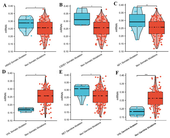 mRNAsi values associated with the mutation status in known PPGLs-susceptibility genes. Comparison of mRNAsi in patients with (A–D) somatic or (E,F) germline mutation and wildtype patients. (* p < 0.05, ** p < 0.01; *** p < 0.001).