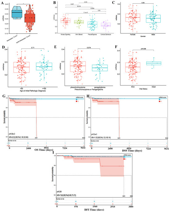 mRNAsi values associated with clinical prognosis and features. Comparison of mRNAsi in (A) metastasis occurences, in different (B) TCGA-expression subtypes, and (C–F) clinical characters (gender, age, tumor location, and vital status). (G–I) Survival and prognosis curve of PGGLs. * p < 0.05.