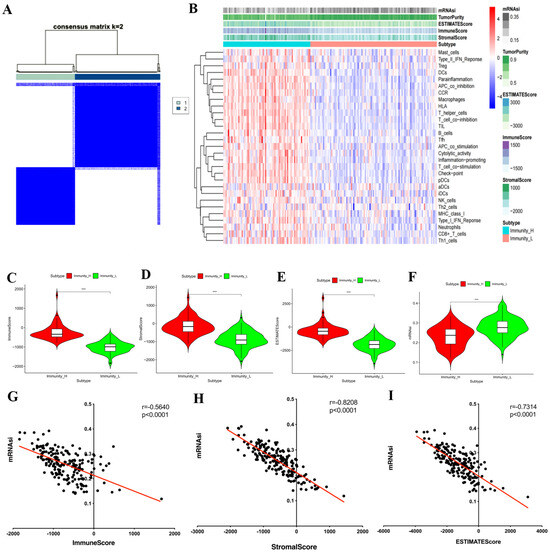mRNAsi values associated with the immune features of PPGLs. (A) Consensus clustering algorithm was employed to obtain stable immune subtypes based on the overall immune activity of PPGLs; (B) the overview of differences in 29 immune signatures, immune score, stromal score, ESTIMATE score, and mRNAsi value between the two immune subtypes; violin plots of the (C) immune score, (D) stromal score, (E) ESTIMATE score, (F) mRNAsi value of PPGLs patients classified by PPGLs immune subtypes; mRNAsi value was significantly negatively associated with the (G) immune score, (H) stromal score, (I) ESTIMATE score. *** p < 0.001.