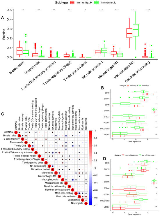 The correlation Between mRNAsi and immune cell infiltration/checkpoint expression. The differences in (A) immune cells infiltration and (B) immune checkpoint expression levels between the two immune subtypes; (C) the correlation between mRNAsi value and immune cell subgroup distribution; (D) The differences in immune checkpoint expression levels among the high mRNAsi group vs. the low mRNAsi group. (* p < 0.05, ** p < 0.01; *** p < 0.001, ns, no statistical difference).