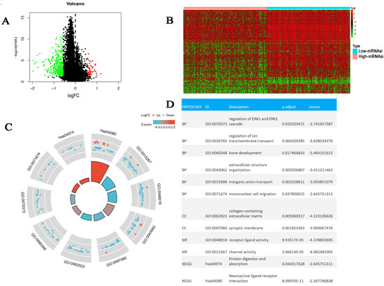 A total of 397 DEGs were identified between the high- and the low-mRNAsi groups (Figure 5A,B). We performed the GO/KEGG analysis to investigate the latent biological behavior and the related pathways involved in these DEGs. Figure 5C displays that 397 DEGs mainly enriched several classic tumor signaling pathways, including ERK1 and ERK2 cascade regulation and extracellular structure organization. Protein digestion and absorption, inorganic anion transport, and mononuclear cell migration are active pathways during tumorigenesis and pathways related to immune response regulation. This could explain why the high mRNAsi group had lower immune activity and a higher malignant potential than the low mRNAsi group.