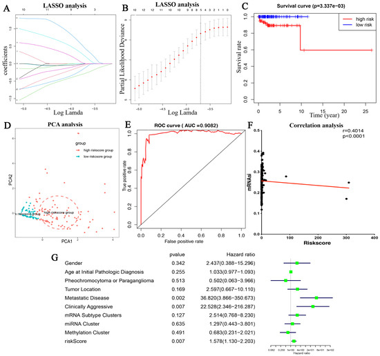 Construction of the mRNAsi-related prognostic model based on the prognostic stemness-related genes. (A,B) LASSO analysis; (C) K-M analysis of risk model; (D) PCA analysis; and (E) ROC curve of the risk model with significant prognostic prediction value analyzed based on all TCGA-PPGLs patients. (F) correlation between mRNAsi values and risk scores (G) univariate Cox analysis.
