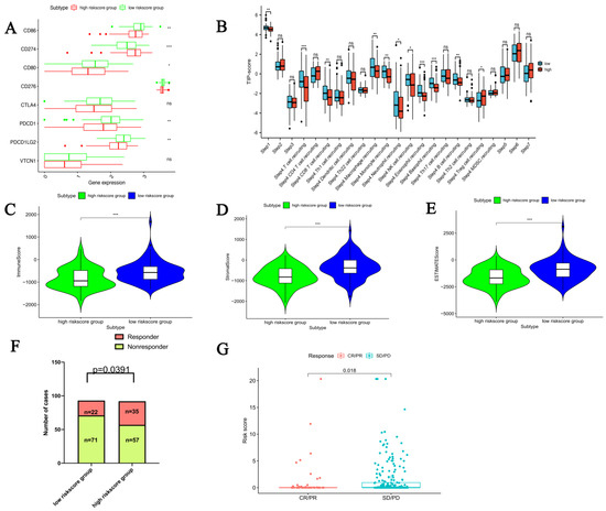 The mRNAsi Risk subtypes displayed distinctive TIME and immunogenomic profiles. The differences in (A) immune checkpoint expression levels and (B) anti-tumor immunity between the two mRNAsi risk subtypes; comparison of (C) immune score, (D) stromal score, (E) ESTIMATE score among the two mRNAsi risk subtypes; comparison of the therapeutic efficacy between high-risk and low-risk subtypes in (F) TCGA-PPGLs cohort and (G) IMvigor210 cohort. (* p < 0.05, ** p < 0.01; *** p < 0.001, ns, no statistical difference).