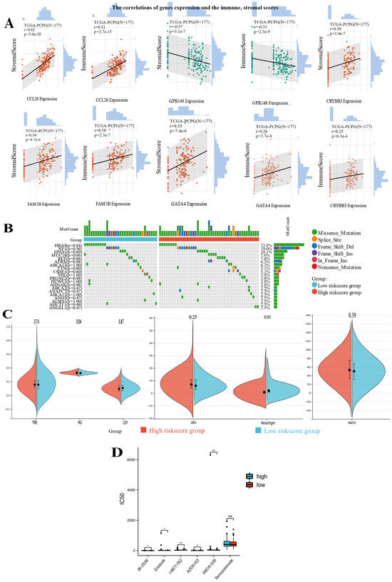 The immune landscape, gene mutation landscape and therapeutic Drug Sensitivities in different mRNAsi risk subtypes. (A) The correlations of CCL26, GPR148, FAM3B, GATA4, and CRYBB3 expression and the immune, stromal scores; The differences in genomic mutation landscape (B) and genomic heterogeneity biomarkers (C) between the two mRNAsi risk subtypes. (D) Comparison of the estimated IC50 values of Erlotinib, I-BET-762, AZD5153, and WEHI-539 between the high- and low mRNAsi groups. (* p < 0.05, ** p < 0.01, ns, no statistical difference).