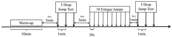 To mimic the state of fatigue during actual basketball play, this study employed SSC for fatigue intervention []. Each participant completed 10 consecutive sets of 10 countermovement jumps with a 30-s interval between each set, which is a lower extremity fatigue bootstrap that has been used frequently [,]. Participants were instructed to stand naturally on the wooden floor with feet shoulder-width apart, place both hands on their waist to minimize arm swing, and perform continuous jumping maneuvers. During the procedure, participants were encouraged and provided with verbal instructions to ensure maximal effort on each jump.