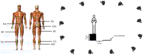 A 14-mm-diameter reflective marker was used to affix to the participant’s right posterior superior iliac spine (to synchronize the time data), and the trajectory of the marker’s movement was captured at a frequency of 120 HZ using a Motive 2.2.0 (OptiTrack, Natural Point, Inc., Corvallis, OR, USA) motion capture system with 13 infrared cameras. EMG data were collected using eight wireless surface EMG sensors (Trigno Avanti, Delsys, Natick, MA, USA), equipped with dual-differential rod (Ag) electrodes (2.7 × 3.7 cm), at an 8-channel 1200 Hz sampling frequency. The sensors were placed on the dominant side of the lower limb muscles, including the erector spinae (ES), rectus abdominis (RA), gluteus maximus (GM), rectus femoris (RF), biceps femoris (BF), lateral gastrocnemius (LG), soleus (SM), and tibialis anterior (TA) with placement locations referenced to the Atlas of muscle innervation zones (Figure 2) []. The sensors were aligned parallel to the muscle fibers []. The skin was shaved and swabbed with alcohol swabs prior to placing the sensors [], and after placing the sensors, surgical waterproof tape (Tegaderm, 3M, St. Paul, MN, USA) was used to secure them [], ensuring stability during the fatigue intervention, as substantial sweating was expected []. GRF data were collected using an OR6-6-2000 force platform (Advanced Mechanical Technology, Inc., Watertown, MA, USA), with a sampling frequency set to 1200 Hz. EMG data and GRF data were captured synchronously in the Motive 2.2.0 motion capture system.