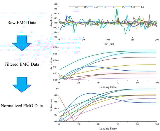 The collected data were imported into Visual 3D software 2024.10.4 (C-Motion, Inc., Germantown, MD, USA) to stage the data. The moment of initial contact was defined when the vertical force was greater than 10 N []. EMG data were exported from 100 ms before the moment of initial contact to 100 ms after the moment of initial contact with the ground []. This time window was chosen because the degree of muscle pre-activation prior to landing reflects a pre-programmed landing strategy []. Additionally, the analysis focused on the first 100 ms after initial ground contact, as this period is critical for understanding landing-related injuries and peak strain loading on the ACL, which typically occurs during this timeframe [].