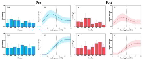 Synergy modules and synergy primitives pre- and post-fatigue intervention in 18 participants (M1 is synergy module 1, M2 is synergy module 2, P1 is synergy primitive 1, and P2 is synergy primitive 2; mean ± SD). In the M-plot, the Y-axis is the weight of the muscle, and the X-axis is the muscle name. In the P-plot, the Y-axis represents the degree of activation of the module, and the X-axis represents the normalized 101 data points, with the 50% dashed line in the middle indicating the moment of initial contact with the ground.