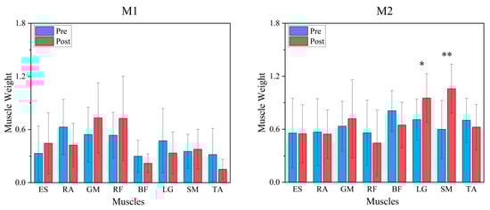 A cosine similarity test of the synergy modules pre- and post-fatigue intervention showed that CS = 0.914 for synergy module 1 and CS = 0.856 for synergy module 2, and both synergy modules were highly similar (CS > 0.8). The paired-samples t-test of each of the two synergy modules showed that synergy module 2 showed a significant difference between the muscle weights of the LG (p = 0.023, d = −0.965, Figure 5) and a very significant difference between the muscle weights of the SM (p < 0.001, d = −1.513, Figure 5) muscles, with no significant difference between the other muscle weights. Whereas in synergy module 1, there was no significant difference in the muscle weights of any muscles.