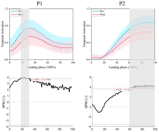 A paired-sample t-test of the synergy primitives SPM1d pre- and post-fatigue intervention showed that synergy primitive 1 showed a significant difference before the initial contact with the ground (18–30% phase, p = 0.008, t* = 3.784, Figure 6), and the synergy primitive 2 showed a significant difference after the initial contact with the ground (60–100% phase, p < 0.001, t* = 3.614, Figure 6).