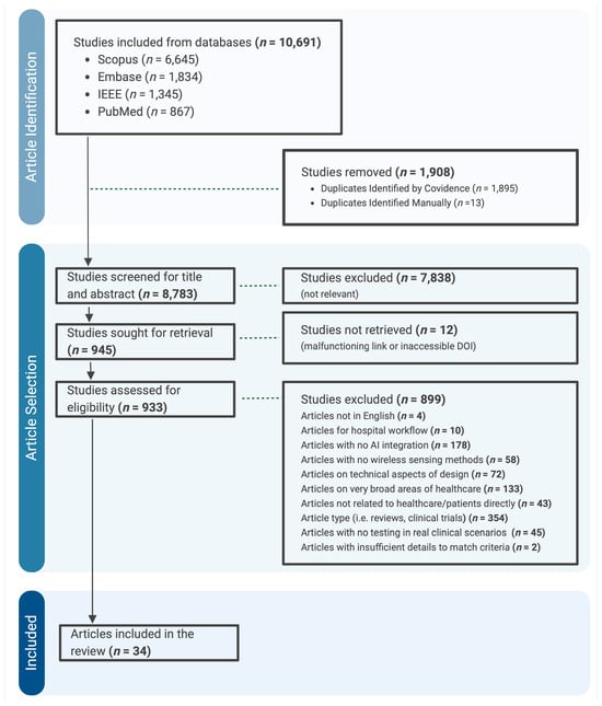 The search identified 10,691 articles from Scopus, Embase, IEEEXplore, and PubMed. After removing duplicates and non-relevant studies, 945 articles were selected for further evaluation. Of these, 34 articles met the inclusion criteria (Figure 1) and were analyzed within the context of their respective medical fields (Table 2).