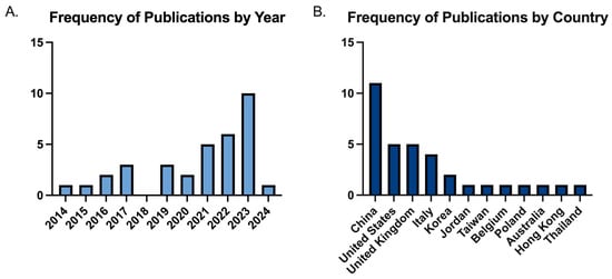 Although the literature search covered articles from 2014 to 2024, most publications (n = 22) appeared after 2020, compared to 12 published in 2020 or before (n = 12) (Figure 2A). Regarding the primary author’s research institution, the majority of studies originated from China (11, 32.4%), the United States (5, 14.7%), and the United Kingdom (5, 14.7%), followed by Italy (4, 11.8%), Korea (2, 5.9%), Jordan (1, 2.9%), Taiwan (1, 2.9%), Belgium (1, 2.9%), Poland (1, 2.9%), Australia (1, 2.9%), Hong Kong (1, 2.9%), and Thailand (1, 2.9%) (Figure 2B).