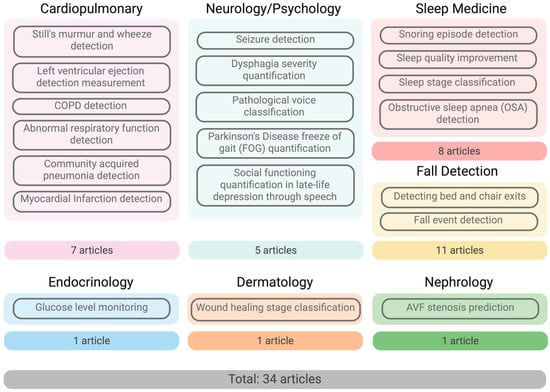 In terms of methodology, 15 of the 34 articles employed deep learning, 16 used machine learning, and 3 utilized both approaches. The majority of the articles were considered clinical or conceptual validation studies for validation of the technology; only a select few articles were feasibility or pilot patient studies or validated through an external dataset (Table 2). The most frequently used wireless sensing method was acoustic (35.3%), followed by CSI (29.4%), radar (23.5%), RFID (5.9%), RF near-infrared spectrometry (2.9%), and mechano-acoustic (2.9%). The articles were categorized into seven distinct areas: fall detection (32.4%), sleep medicine (23.5%), cardiopulmonary (20.6%), neurology and psychology (14.7%), endocrinology (2.9%), dermatology (2.9%), and nephrology (2.9%) (Figure 3).