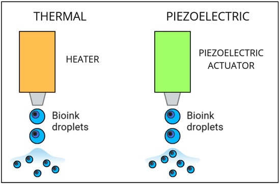 Schematic representation of inkjet bioprinting techniques: thermal process and piezoelectric process [,] (image created utilizing Canva®).