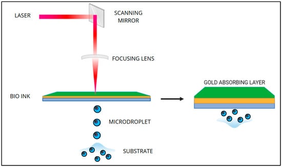 Schematic representation of laser-assisted bioprinting [,,] (image created utilizing Canva®).
