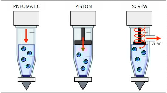 Micro-extrusion bioprinting is the most popular method. It is based on pressure technology, where the bioink filament is ejected by means of a nozzle onto the substrate through pneumatic or mechanical pressure. This system is configured to a deposit continuous layer of bioinks to form the 3D construct. Once it is extruded, the material is solidified in many ways, such as chemical induction, heat, or photoinduced crosslinking. One of the problems with this printing methodology is the limited resolution [,]. This kind of technique employs mechanical forces to extrude the ink, and these forces can be classified into three categories: pneumatic, piston and screw-driven. The first one uses pressurized air to drive the ink, while the second and the last ones use a piston or a screw to extrude the bioink, providing a larger mechanical force and the best control during the printing (Figure 5) [,].