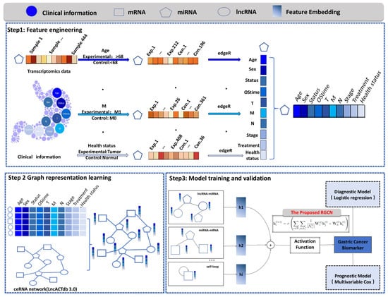 The workflow of the proposed GCBRGCN model. Step 1: Feature Engineering. Clinical data and GC whole transcriptome sequencing data were collected. Samples were stratified based on clinical information, and differential expression analysis was performed using edgeR. The calculated log-fold change values of differentially expressed genes were utilized as node features. Step 2: Graph Representation Learning. Nodes with ten characteristics were embedded and integrated into a ceRNA heterogeneous network, where nodes represent different RNA molecules, including mRNA, lncRNA, and miRNA. Step 3: Model Training and Validation. The RGCN algorithm was employed for node classification, leveraging a multi-layer message passing mechanism to capture higher-order topological features. Based on the classification results, key biomarkers associated with gastric cancer were identified to construct diagnostic and prognostic models, and their potential molecular mechanisms were further investigated.