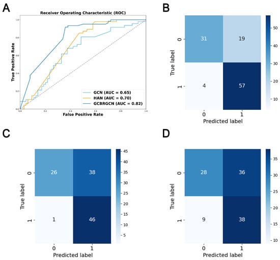 ROC curve and confusion matrix for model performance evaluation. (A) ROC curves of GCBRGCN, HAN and GCN models. (B) Confusion matrix of the GCBRGCN model. (C) Confusion matrix of the HAN model. (D) Confusion matrix of the GCN model.