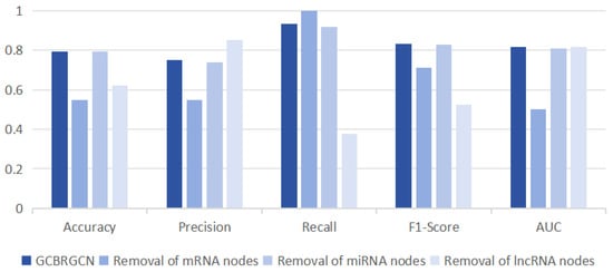To assess the individual contributions of mRNA, miRNA, and lncRNA to the GCBRGCN model, we conducted ablation studies, systematically removing one type of node at a time. Consistent with our expectations, we observed that the removal of mRNA nodes had the most significant impact on model performance, resulting in the largest reductions in accuracy (0.2432), precision (0.2005), and AUC (0.3172). This outcome could be attributed to mRNAs being the primary functional RNAs, and the fact that the majority of known GC biomarkers are mRNA-based. LncRNAs had the most substantial impact on the model’s recall (0.5574), and they also significantly affected the accuracy (0.1712) and F1-score (0.3094). Interestingly, miRNAs had a negligible effect on model performance across all metrics, including precision (0.0132), recall (0.0164), F1-score (0.0025), and AUC (0.0090), possibly owing to the inherent stability of miRNA biomarkers (Figure 3).