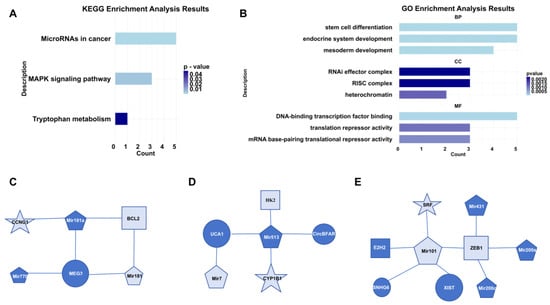 Our analysis revealed that novel GC biomarkers were predominantly associated with miRNAs in cancer, the MAPK signaling pathway, and tryptophan metabolism according to KEGG enrichment analysis (Figure 4A). Additionally, they were enriched in endocrine system development, heterochromatin, and DNA-binding transcription factor binding based on GO enrichment analysis (Figure 4B). To elucidate the interactions between novel GC biomarkers and established ones, we constructed three subnetwork focusing on the novel GC biomarkers. Our analysis revealed that the novel GC biomarkers CCNG1, BCL2, and Mir181 were linked to MEG3 and Mir181a which were known as GC biomarkers. MEG3 has been shown to suppress the proliferation and invasion of GC cells in vitro, and it can upregulate BCL2 through its compete combine against Mir181a [] (Figure 4C). Similarly, the novel GC biomarkers HK2, Mir7, and CYP1B1 were connected with the known GC biomarkers UCA1, Mir513, and circBFAR. The UCA1/Mir513/CYP1B1 axis plays a role in modulating cisplatin resistance in human GC cells [], and circBFAR has been demonstrated to enhance GC proliferation by targeting the Mir/HK2 axis []. Mir7 can bind to specific sites on UCA1, modulating the target EGFR [] (Figure 4D). Additionally, the novel GC biomarkers Mir101 and ZEB1 emerged as central nodes in the subnetwork. Mir101 can directly target and repress the expression of the novel GC biomarker SRF []. Oncogene SNHG6 could regulate the Mir101/ZEB1 axis at the post-transcriptional level and recruit the enhancer of EZH2 to the promoter of P27, thereby silencing P27 expression at the transcriptional level [] (Figure 4E).