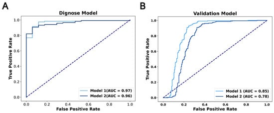 (A) ROC curves for the diagnosis model using TCGA datasets. (B) ROC curves for the diagnosis model using external validation datasets.