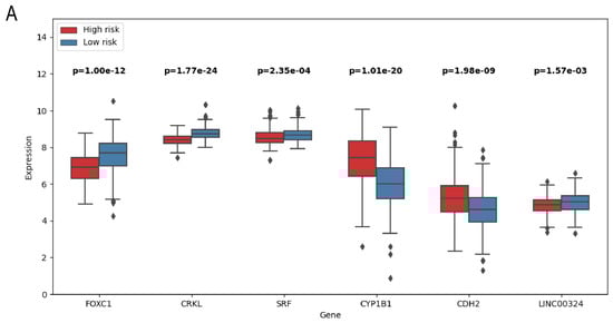 SRF, CRKL, CYP1B1 and CDH2 were identified as new potential prognostic biomarkers for GC. Firstly, SRF, a downstream target of the MAPK/ERK signaling pathway, promotes cell proliferation and the development of GC metastasis []. Additionally, SRF fosters the proliferation and invasion of GC cells by suppressing the expression of HOTAIR []. Secondly, CRKL, a substrate of BCR-ABL tyrosine kinase, is involved in the transformation process of BCR-ABL into fibroblasts []. Mir335 targets CRKL, thereby inhibiting the migration, invasion, and proliferation of tumor cells, arresting the cell cycle at the G0/G1 phase, and promoting apoptosis in GC cells []. Thirdly, CYP1B1, a member of the cytochrome P450 supergene family, plays a role in the regulation of several crucial transcription factors through the oxidation and metabolism of various carcinogenic precursors and anticancer drugs []. Finally, MFGE8 induces the expression of SNHG14, which in turn promotes the cellular epithelial–mesenchymal transition by stabilizing CDH2 [].