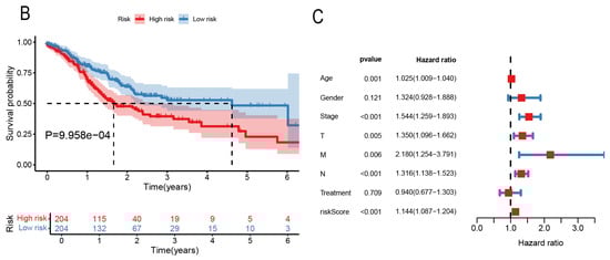 (A) Boxplot of prognostic related genes in high- and low-risk groups. (B) Kaplan–Meier survival curves of patients in high- and low-risk groups. (C) Forest map of bivariate Cox risk regression analysis of forest map.