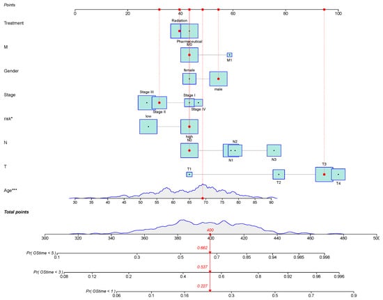 Nomogram to predict the probability of 1-year, 3-year, or 5-year OS in patients with GC. Predictor points are obtained from the points scale according to the prognostic contribution of each variable subset. These, added together, give a total point score which can be translated into probability of survival at a specific timepoint (1-year, 3-year, or 5-year) by charting the score on the total points scale and projecting onto the probability of survival scale. The survival estimates are given as the probability of survival. For instance, if a patient’s total score is 400 points, calculated based on actual clinical information, the corresponding probabilities of OStime being less than 1 year, 3 years, and 5 years are 0.227, 0.537, and 0.662, respectively. Statistical significance of variables is indicated with asterisks, reflecting the strength of the association between the variable and OStime. * means p < 0.05; *** means p < 0.001.