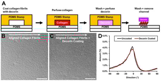 To simulate both the aligned topography and proteoglycan composition of the in vivo corneal stroma ECM, we fabricated micropatterns of aligned collagen fibrils with decorin incorporated after fibril polymerization. Aligned collagen micropatterns were fabricated by perfusing a collagen solution at well-defined shear rates through a microfluidic channel bonded to a PDMS-coated glass cover slip [,]. Next, the aligned collagen fibrils were coated with decorin by perfusing a solution of decorin in PBS through the microfluidic channel over the previously deposited aligned fibrillar collagen, incubating for 1 h at 37 °C, and washing with ultrapure water (Figure 1). The microfluidic channel was then removed and the decorin-coated aligned collagen fibril micropatterns were allowed to dry prior to use.
