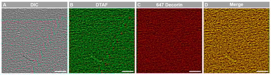 To visualize the decorin coating, some experiments utilized decorin conjugated with Alexa Fluor 647. Decorin was labeled with Alexa Fluor 647 via a protein labeling kit according to manufacturer’s protocol (Invitrogen; Carlsbad, CA, USA). For these experiments, aligned collagen fibril micropatterns were coated with a solution of the fluorescent decorin diluted 1:100 in 1× PBS. Substrates were then counterstained for collagen with 5-([4,6-Dichlorotriazin-2-yl]amino) fluorescein hydrochloride (DTAF) and imaged with a Zeiss Axio Observer Z1 inverted microscope (Carl Zeiss, Thornwood, NY, USA) using a 63× oil immersion plan-apochromatic objective (NA = 1.4) and an Orca Flash 4.0 monochrome CMOS camera (Hamamatsu Photonics; Bridgewater, NJ, USA).